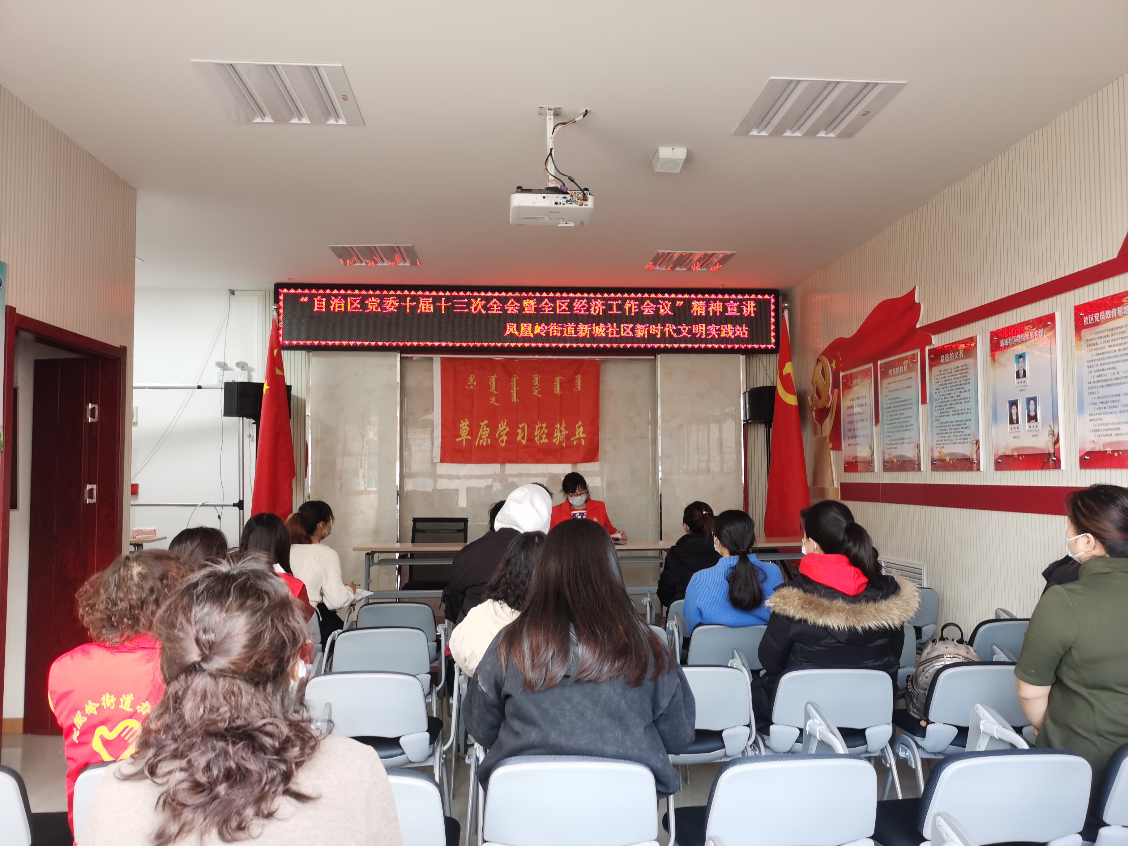2020年12月27日至28日,中国共产党内蒙古自治区第十届委员会第十三次全体会议暨全区经济工作会议在呼和浩特召开。这次全会是在决胜全面建成小康社会、开启社会主义现代化建设新征程的关键时期召开的一次重要会议。2020年1月11日凤凰岭街道新城社区新时代文明实践站组织辖区党员先锋志愿服务队的志愿者和社区全体工作人员开展了“自治区第十届委员会第十三次全体会议”精神宣讲活动。